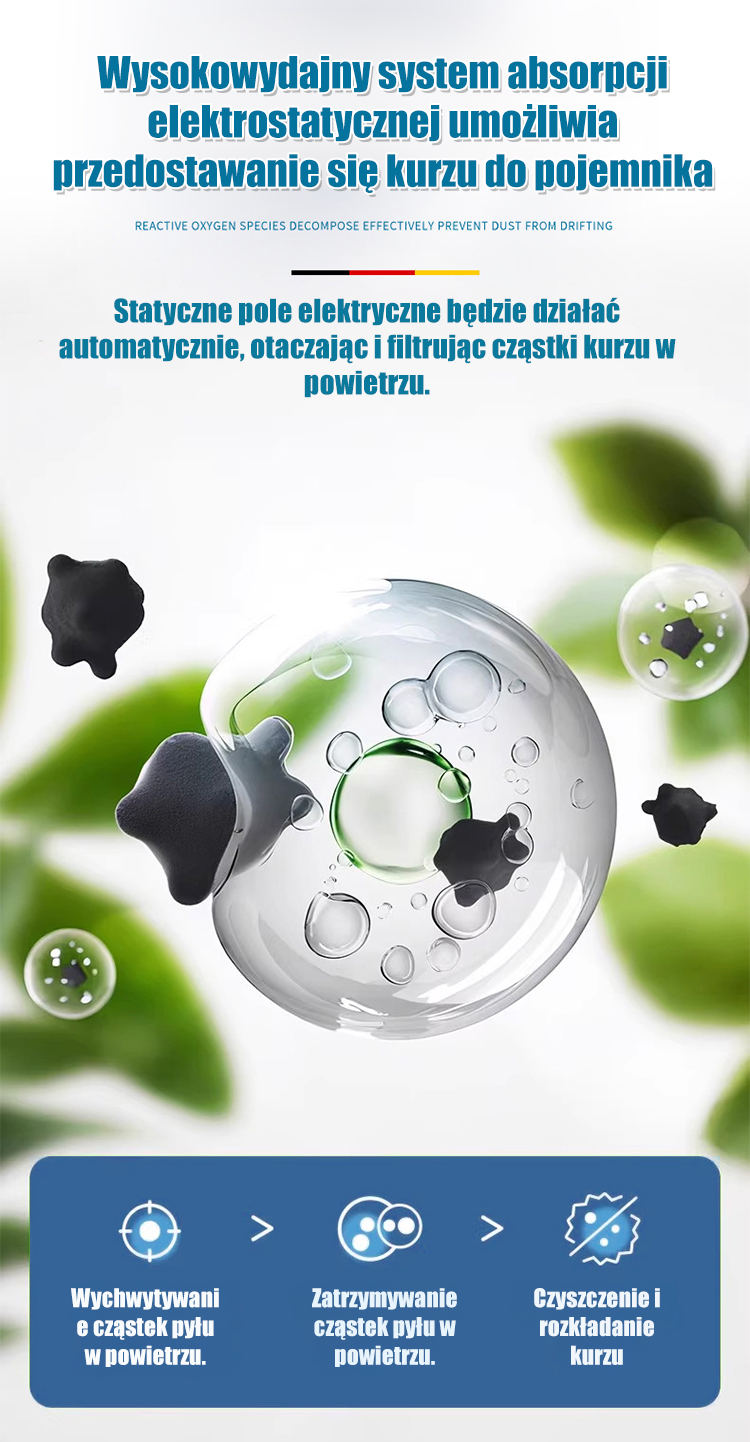 ⚡ Bezprzewodowy & bezsilnikowy odkurzaczTechnologia elektrostatyczna → nie potrzebuje prądu!Wystarczy postawić w miejscu → automatycznie zbiera kurz.